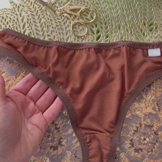Women’s Low-Waist Panties Made of TENCEL™ Jersey and Recycled Lace - Cinnamon brown with blue flower lace
